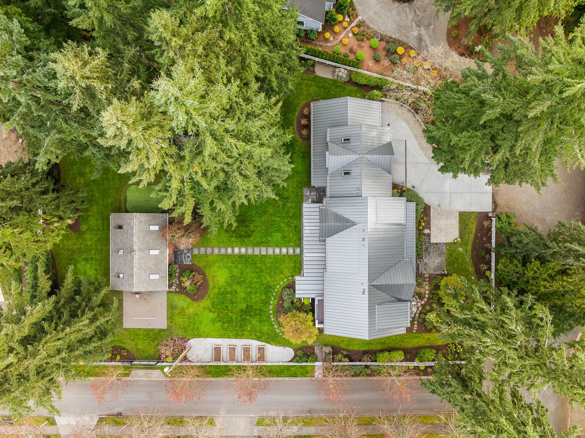 A rare, "shy acre" sanctuary nestled in a peaceful enclave just steps from the trails of Bridle Trails State Park.